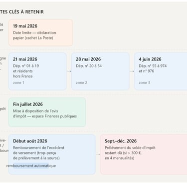Rappel important : un acompte de 60 % sur les crédits et réductions d'impôt récurrents (emploi à domicile, garde d'enfants…) a été versé en janvier 2026 sur la base des dépenses de 2024. Si les dépenses éligibles ont diminué en 2025, il convient de vérifier l'impact sur la régularisation à venir et, le cas échéant, d'anticiper un éventuel remboursement de trop-versé.