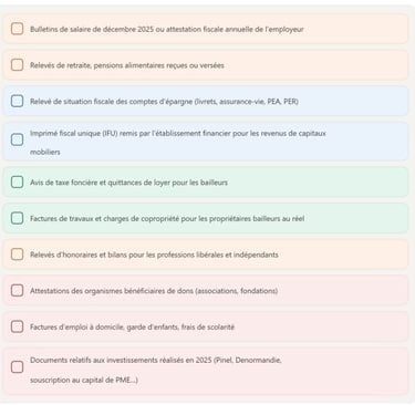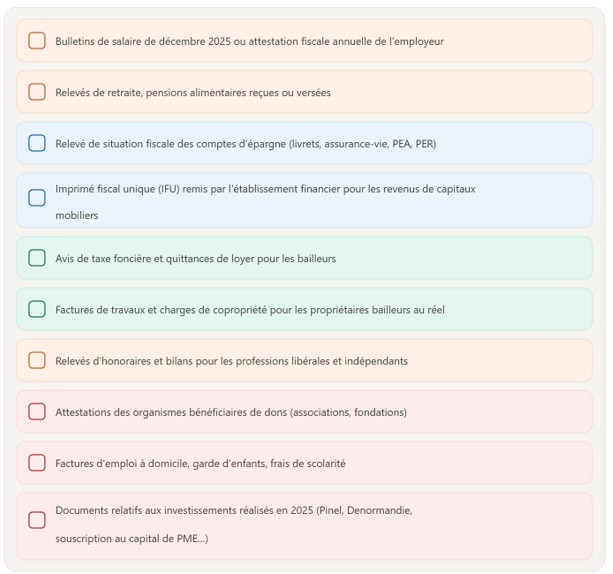 Les justificatifs (attestations d'employeur, imprimés fiscaux uniques, factures de travaux, attestation du montant des dépenses pour emploi à domicile, etc.) ne sont pas à joindre à la déclaration mais doivent être conservés et tenus à disposition en cas de contrôle ou de demande de l'administration fiscale.